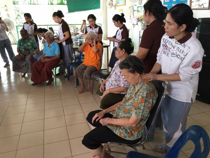 护理学院 曼谷大学武里府 通过维护文化艺术 与3年级护生合作,组织了“泰国智慧计划”,以照顾老年人的健康 用冰片水放松按摩 (一年级护理学生的泰国智慧产品)与老年人护理课程的教学和学习相结合,在佛统长者之家组织了活动。和Chalerm Rajakumari老人之家 (黄河爪)